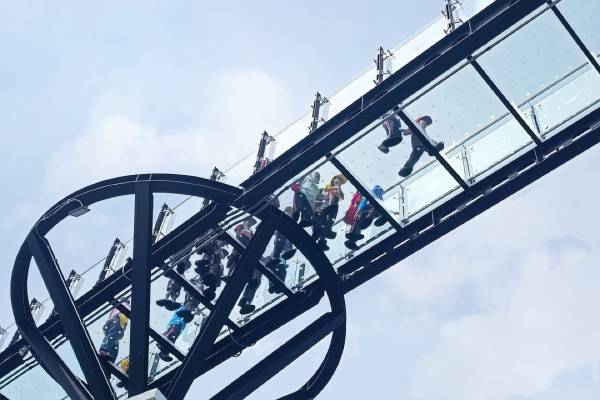 สะพานกระจกใสที่ยื่นออกไปเหนือแม่น้ำ มองเห็นแม่น้ำสองสายไหลมาบรรจบกันแบบสุดลูกหูลูกตา โดยรอบมีฉากหลังเป็นภูเขาและธรรมชาติที่งดงามสุดๆ โดยเฉพาะช่วงเย็นที่พระอาทิตย์ตก สีทองจะสะท้อนบนกระจกและสายน้ำ… สวยจนลืมหายใจ